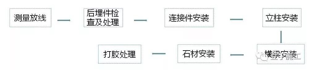 适用于室内墙面不超过4 m高度的、厚度大于10mm的天然石材或复合石材墙面的施工,特别是基层平整度和垂直度较差、面层石材厚度较薄的石材施工。石材圆柱和室外墙面不宜采用。施工流程:
