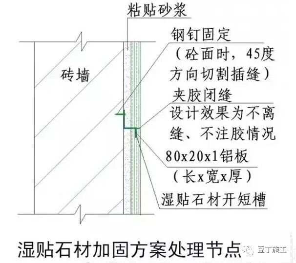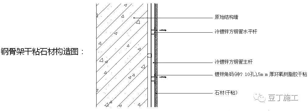 骨架干粘石材采用埋板与基层墙面连接,竖向龙骨和横向龙骨均采用方钢做成龙骨架与埋板焊接,石材通过环氧树脂A、B双组份工程胶与横龙骨上的短角钢或角码进行粘贴以达到装饰效果。
