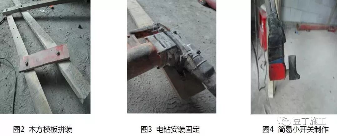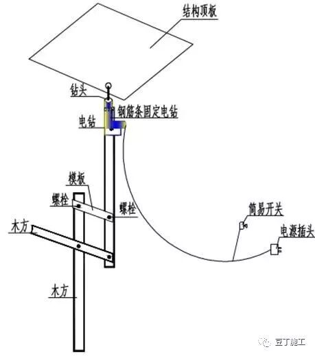 钻孔施工前需要利用手提式电钻(钻头根据现场植入钢筋直径确定)、木方(可根据实际情况确定)、4颗8mm螺栓、三根直径为20mm钢筋条、一圈黑色胶带、自制安全简易小开关等制作一款简易操作工具。