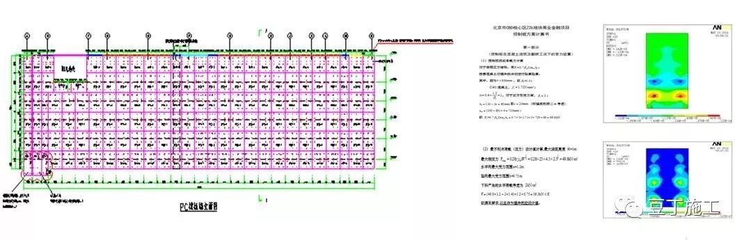 我们通过一段动画来加深印象,PCF单侧支模体系施工工艺流程:PC板的加工制作→PC板的运输堆放()→PC板的吊装就位→PC板的安装校正→PC板的临时固定→脚手架搭设和防水施工→PC板螺杆固定和钢筋绑扎→内侧模板支设和支架安装→混凝土浇筑→下一层周转施工。一、PC板的排版和设计根据结构基准图,对PC板的布置范围、PC板块的分隔、间距,每块PC板的尺寸和位置、PC板的固定位置、连接方式以及特殊节点的处理均进行细致的设计,并通过ansys进行计算,形式PC板设计图一套、计算书一套,并通过的设计单位、监理单位和业主单位的审核。