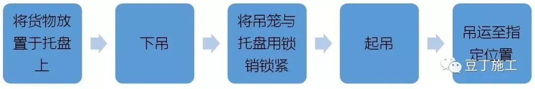 4.施工操作要点本工程采用“一笼多盘”的方式吊装,可在多个位置同时向托盘中放置货物,操作极其简单。将货物放置托盘之后,信号工指挥塔吊将吊笼吊下,底部工人将吊笼与托盘用锁销锁紧,信号工指挥塔吊将吊笼吊至指定位置完成吊装作业并可直接进行下一位置托盘的吊装。