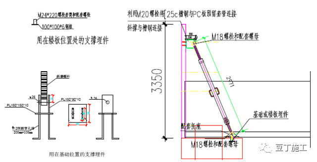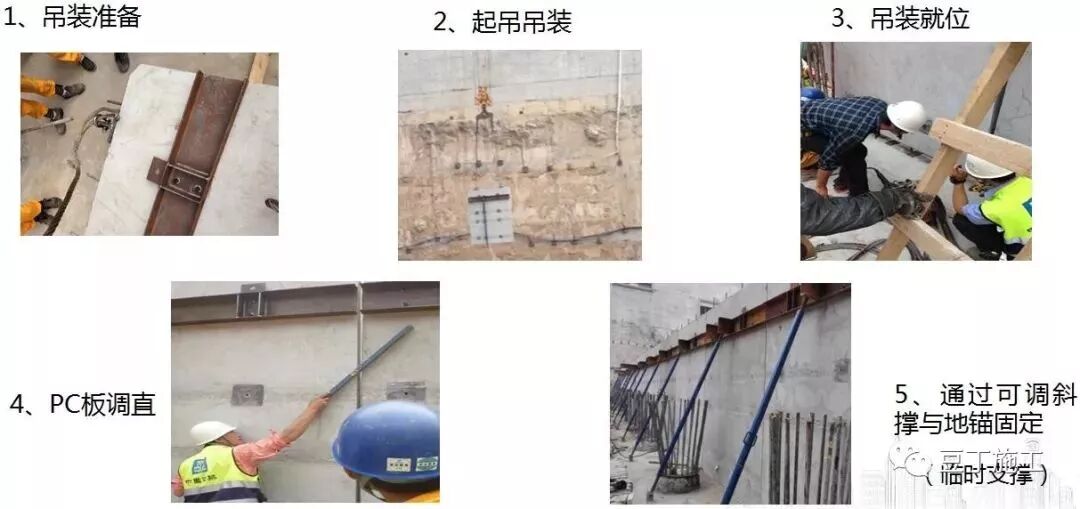 1、PC板通过预埋螺母与现场吊具连接固定,槽钢通过预埋螺栓与PC板固定;2、起吊吊装,将钢丝绳穿入PC板上端的两个吊环内并确认连接紧固后,在板的下端放置两块海棉胶垫,以预防PC板吊离地时板的边角被撞坏。3、吊装就位:用塔吊缓缓将PC板吊起,待板的底边升至距地面50cm时略作停顿,再次检查吊挂是否牢固,板面有无污染破损。确认无误后,继续提升,慢慢靠近安装作业面。4、PC板调直;5、通过可调斜撑与地锚固定:首先安装最底层首块PC板,考虑外墙边距工程桩仅300mm,为保证PC板的固定,在其下部施工条形基础。然后安装第一块PC板并施工临时支撑,临时支撑底部通过M18螺栓与基础或楼板预埋埋件固定,上部通过M18螺栓和配套螺母与槽钢固定。