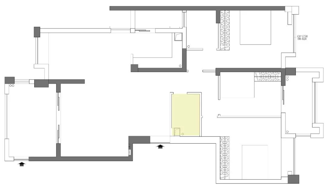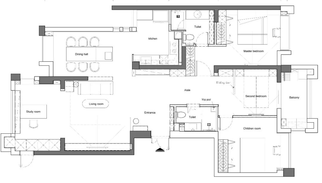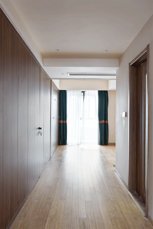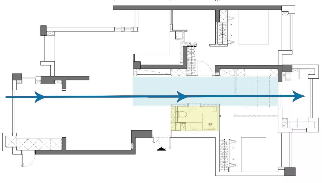 3、南侧中间的客房面向走廊的墙敲掉,改成推拉门,平时房门敞开,使南侧自然光自由进入。
