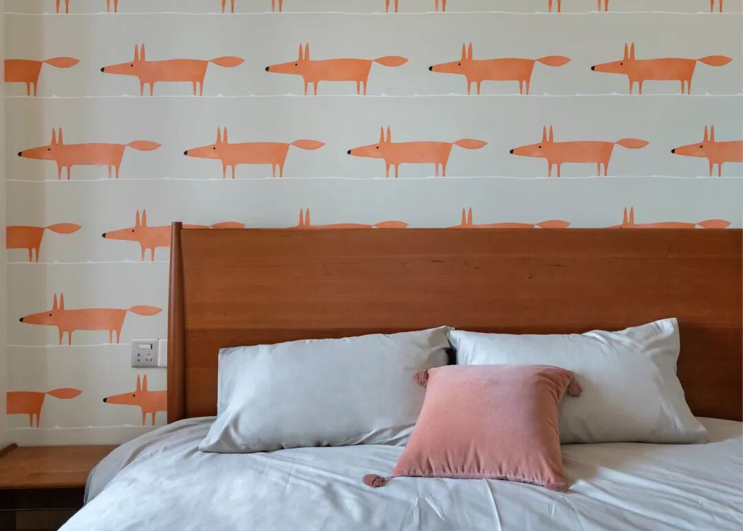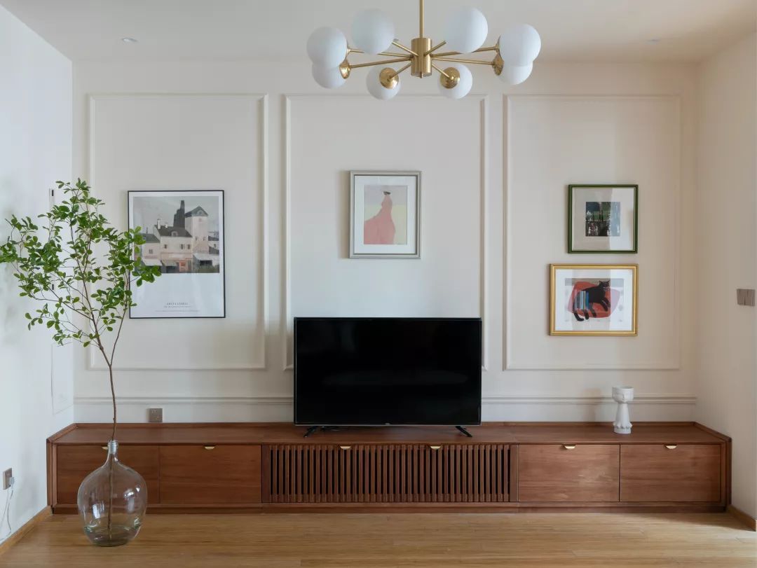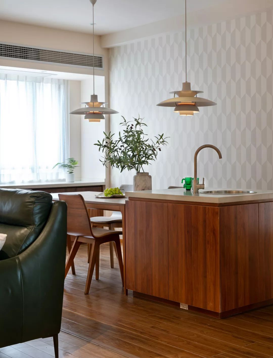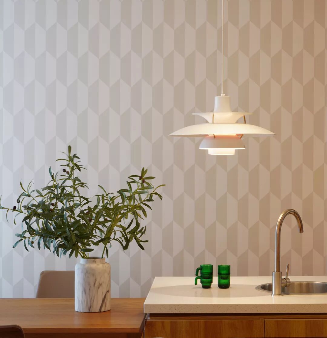 浅灰色几何图样与乳白色吊灯相互映衬,