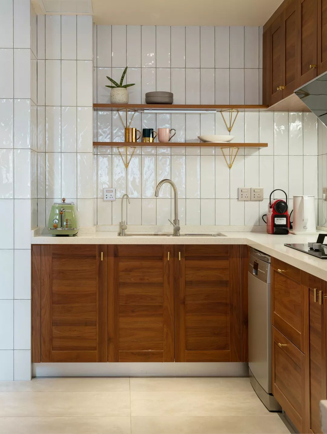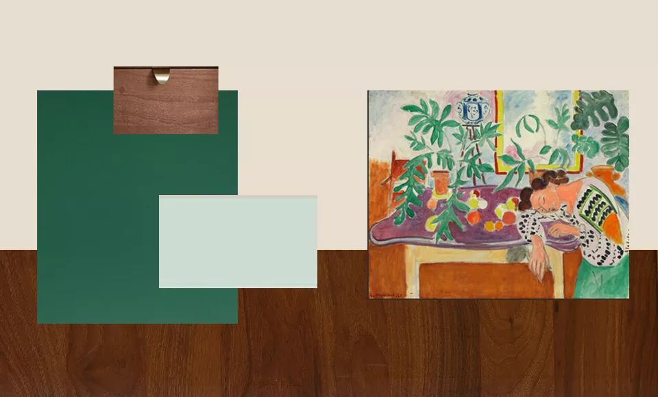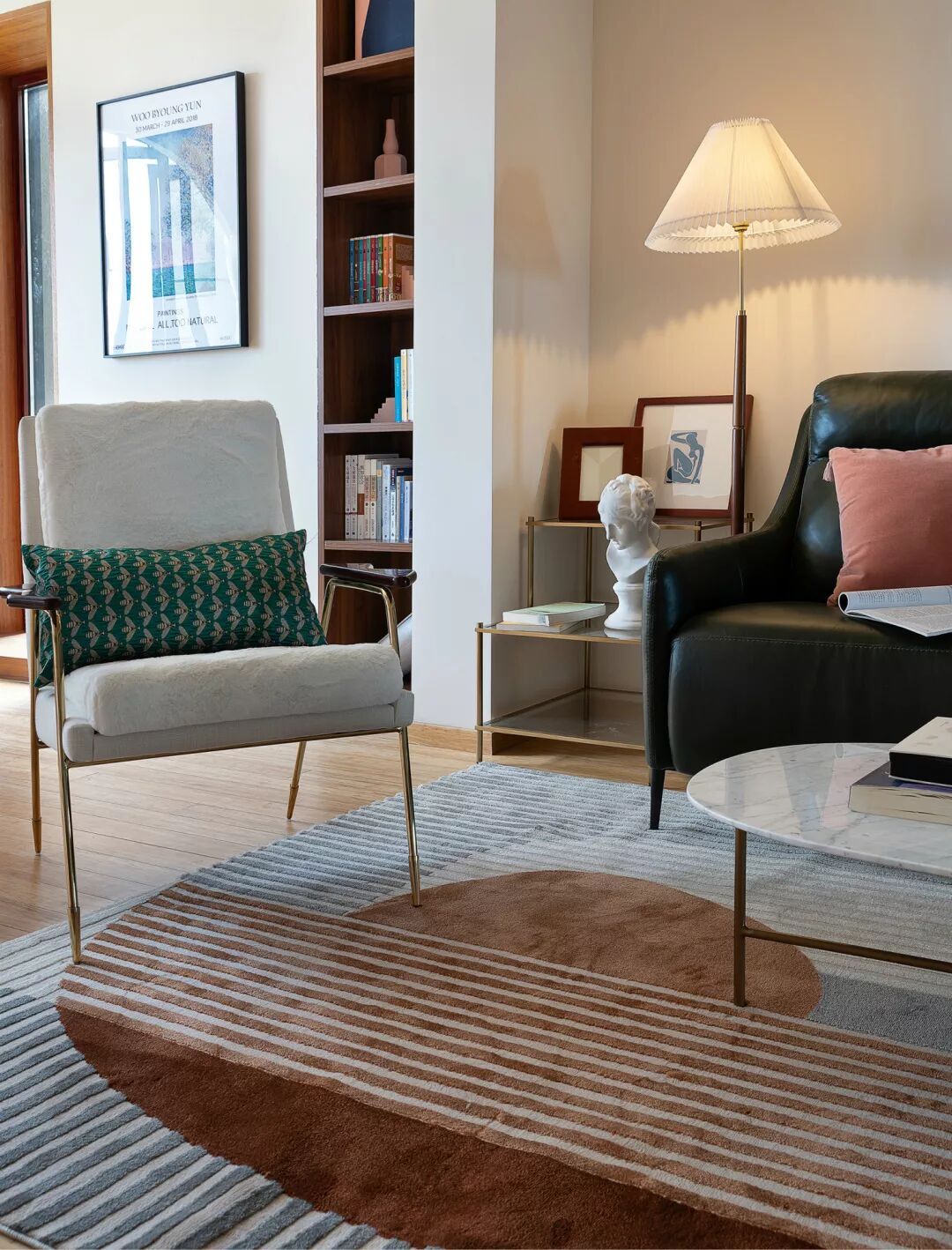 灰色条纹提亮,焦糖色几何块呼应家具,