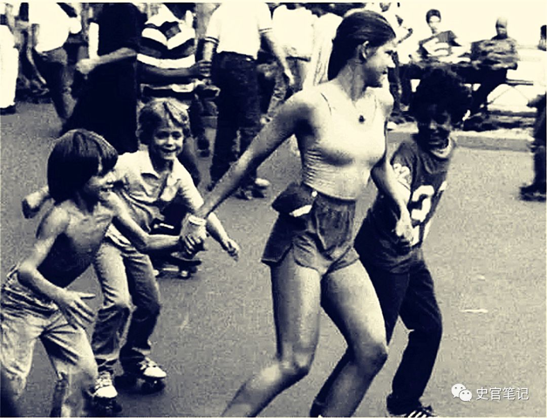 不可思议的老照片,图为美丽的少女带着弟弟溜冰,引来路人围观。