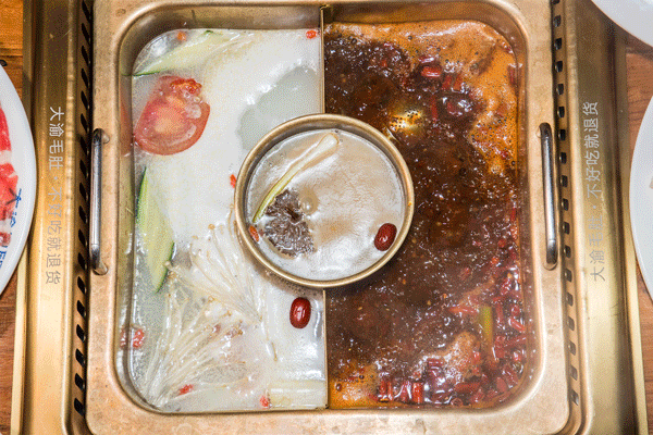 大渝火锅的汤底是分别用猪骨、牛骨熬制而成,翻腾的锅底辣而不燥,色泽红艳,浓郁鲜香,让人大呼过瘾!