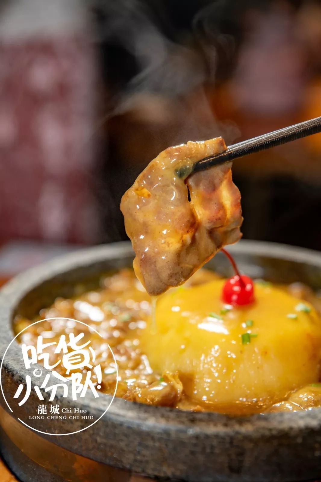 吃的是牛腩锅物料理牛腩当然少不了啦,经过13种香料腌制的新鲜土黄牛腩,腾云驾雾而来,颇有种牛魔王出场的架势。