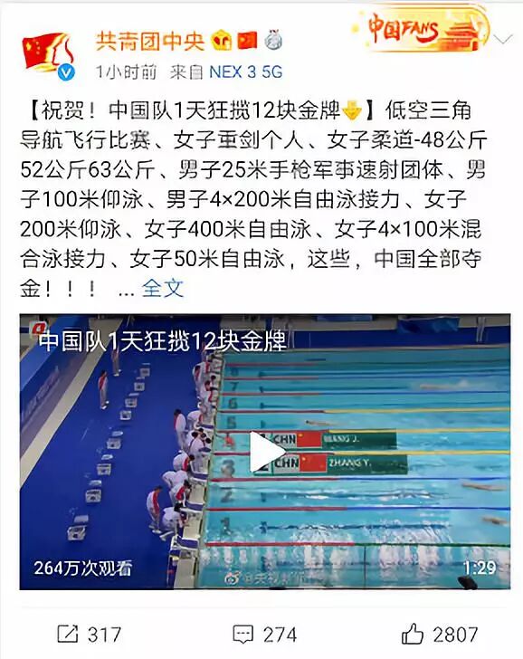 作为综合性赛事中的金牌大户,游泳项目首日诞生9枚金牌。中国队不但摘得包括6枚金牌在内的共12枚奖牌,还刷新多项赛会纪录。