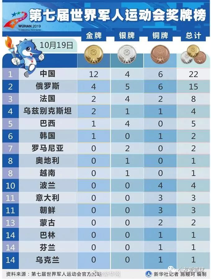 19日,第七届世界军人运动会(以下简称“军运会”)迎来开幕后的首个比赛日,共产生22枚金牌。中国代表团首日进账12枚金牌、4枚银牌和6枚铜牌,暂列奖牌榜榜首。来自中国八一射击队的谢振翔、金泳德和姚兆楠,射落赛事首金。