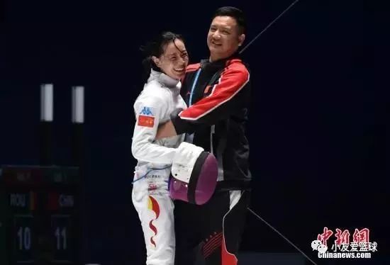 图为中国选手孙一文与教练相拥庆贺此次比赛好成绩。