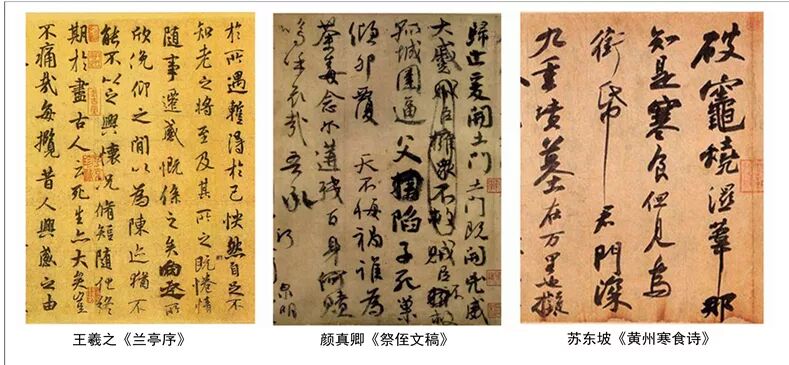 圖《蘭亭集序》、《祭姪文稿》、《黃州寒食詩帖》片段