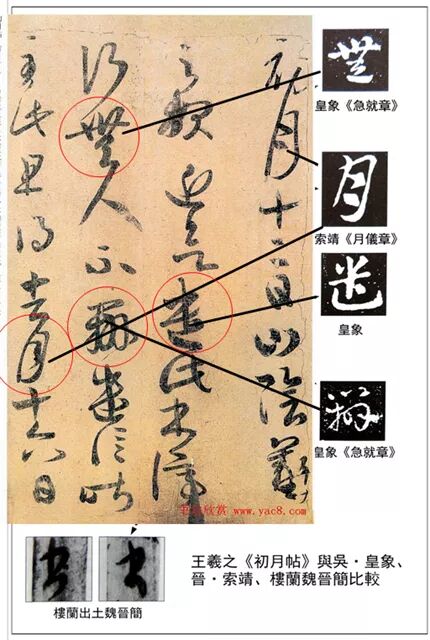 從中上面《初月帖》里的一些字里,我們可以看到“王家”書風的背景,也能明白一個一個奧道理,即書法風格“漸變”是常態,“突變”是異狀,絕少有橫空出世的“黑馬”。