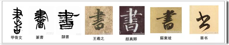 上圖里的“書”,是甲骨文、篆書、隸書、行書、楷書和草書,是中國最具代表性的幾種書體,當然還有很多體式,如鐘鼎文、石鼓文、竹簡、木簡、帛書等。