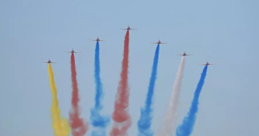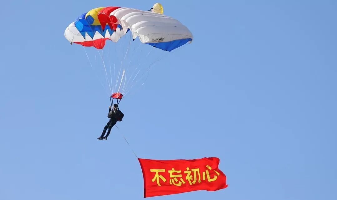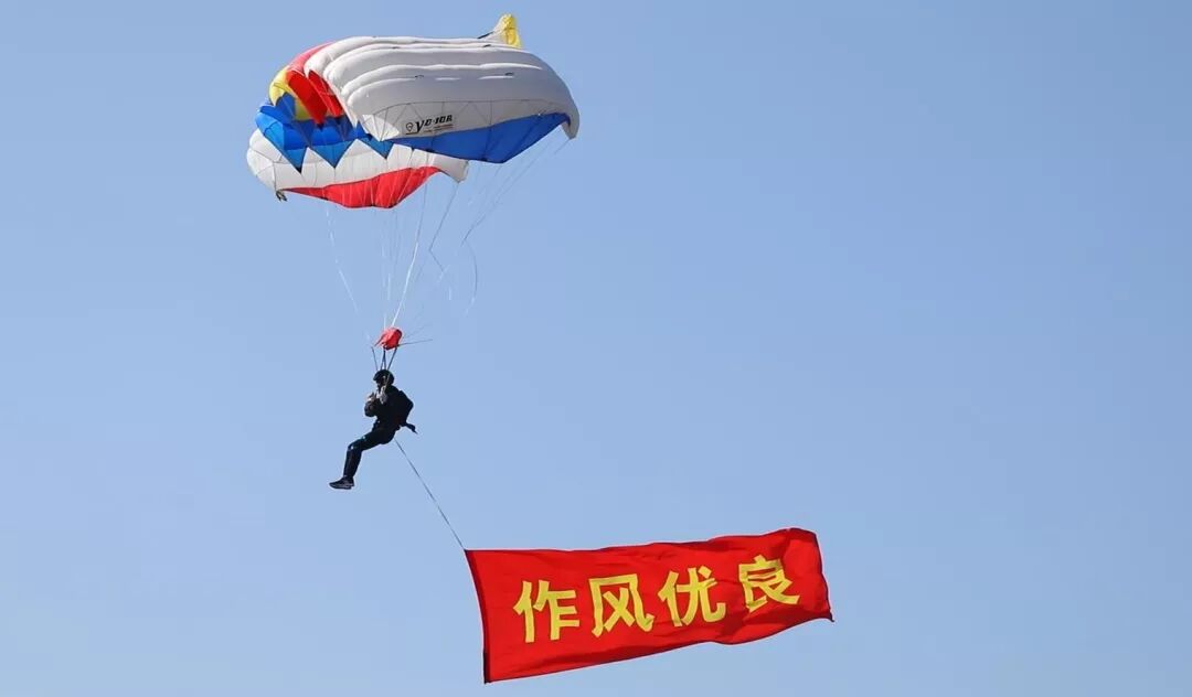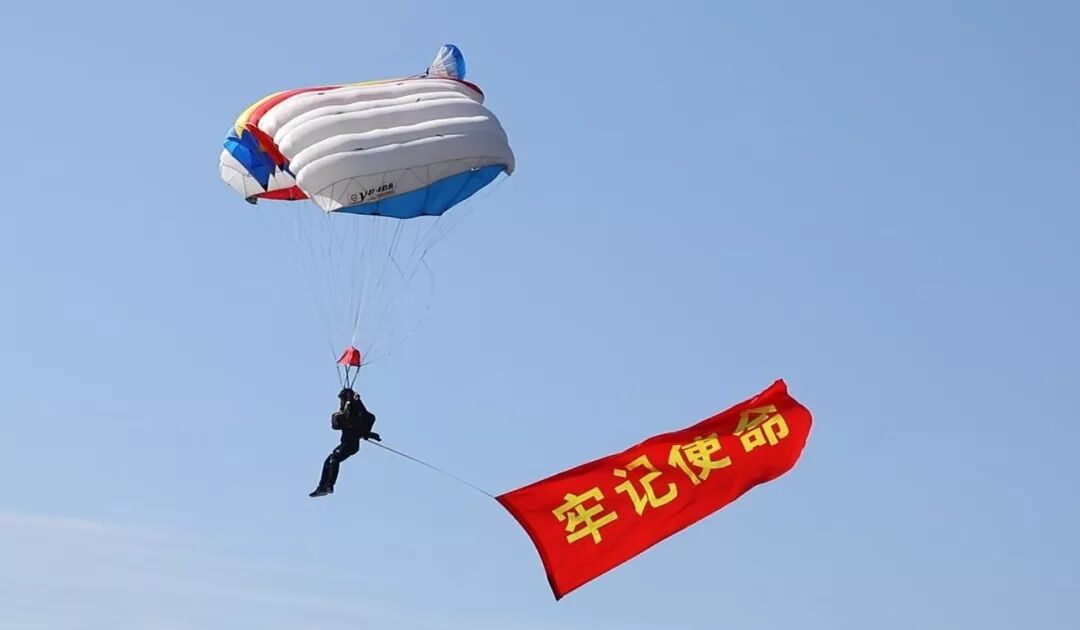 上午9时30分许,中国人民解放军“八一”跳伞队队员携中华人民共和国国旗、八一军旗和空军军旗从空中跃下,拉开了蓝天盛典的帷幕。空军航空大学“蓝鹰”跳伞表演队携7幅标语昭示了空军官兵矢志强军、追梦空天的凌云壮志。