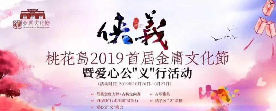 首届桃花岛金庸文化节侠义行活动,由舟山桃花岛镇政府、射雕英雄传旅游城、上海户外联盟、上海爱美融合艺术发展中心联合主办,浙东琴社、塔湾金沙协办。致力将文化和旅游结合,把侠义精神传播得更远。