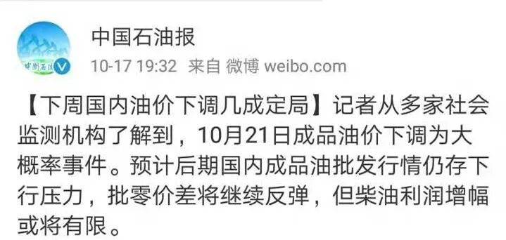 数据显示,截至 10 月 18 日,国内第 9 个工作日,参考原油变化率为 -4.02%,对应国内汽柴油下调 180 元 / 吨,折合升价为下跌 0.13 元 / 升左右。