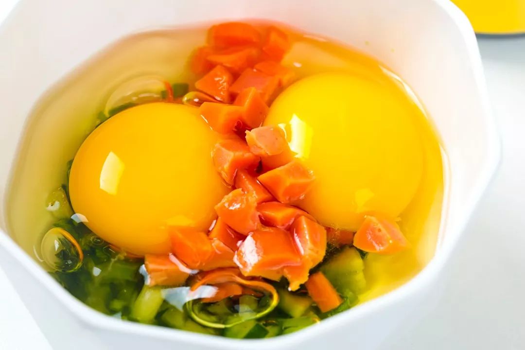 1.内胆放油烧热,将蔬菜、火腿切碎与鸡蛋混合。