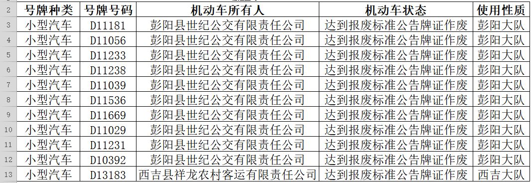 经核查,以下11辆机动车已达到国家规定的报废标准,现根据公安部《机动车登记规定》第三十一条之规定,公告其机动车登记证书、号牌、行驶证作废,《宁夏道路交通安全条例》第十六条 机动车达到报废标准的,不得转籍过户。应当报废的机动车,其所有人在办理新购机动车注册登记前,必须先行办理报废机动车的注销登记。请机动车所有人或管理人尽快到固原车管所办理机动车注销登记手续。已达到报废标准的机动车上道路行驶,将按照有关法律规定进行严厉处罚。