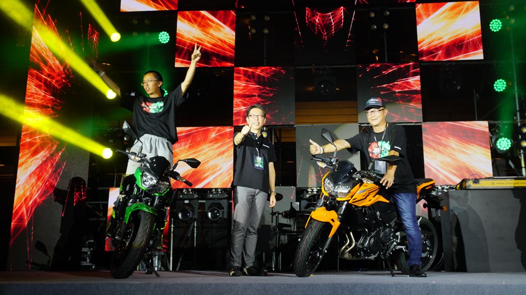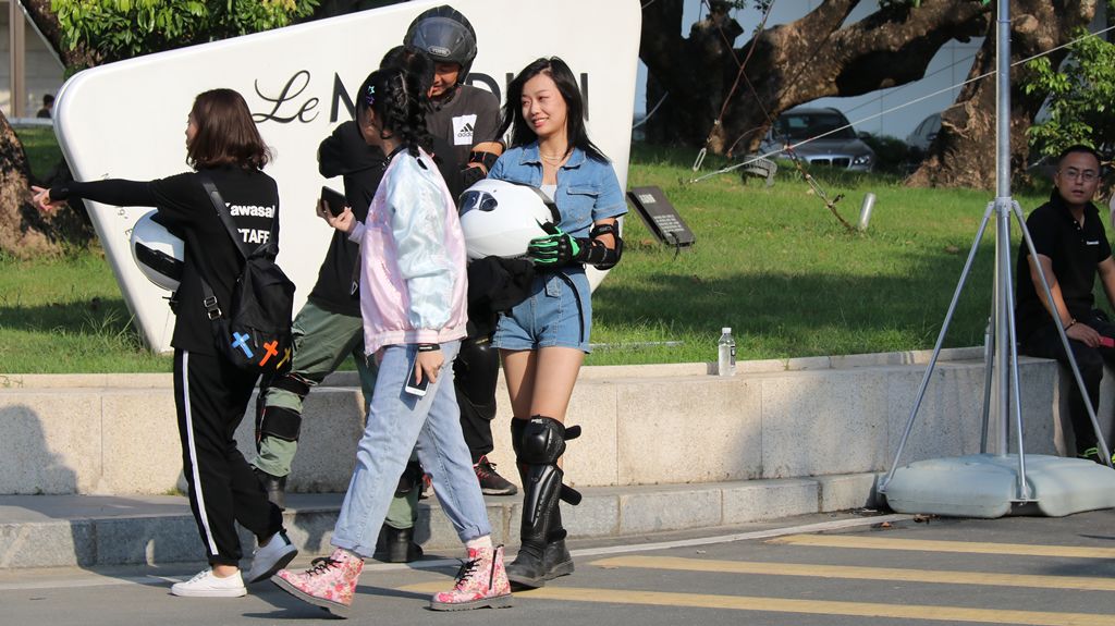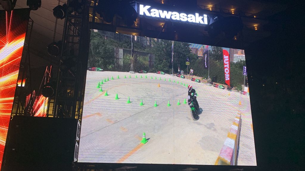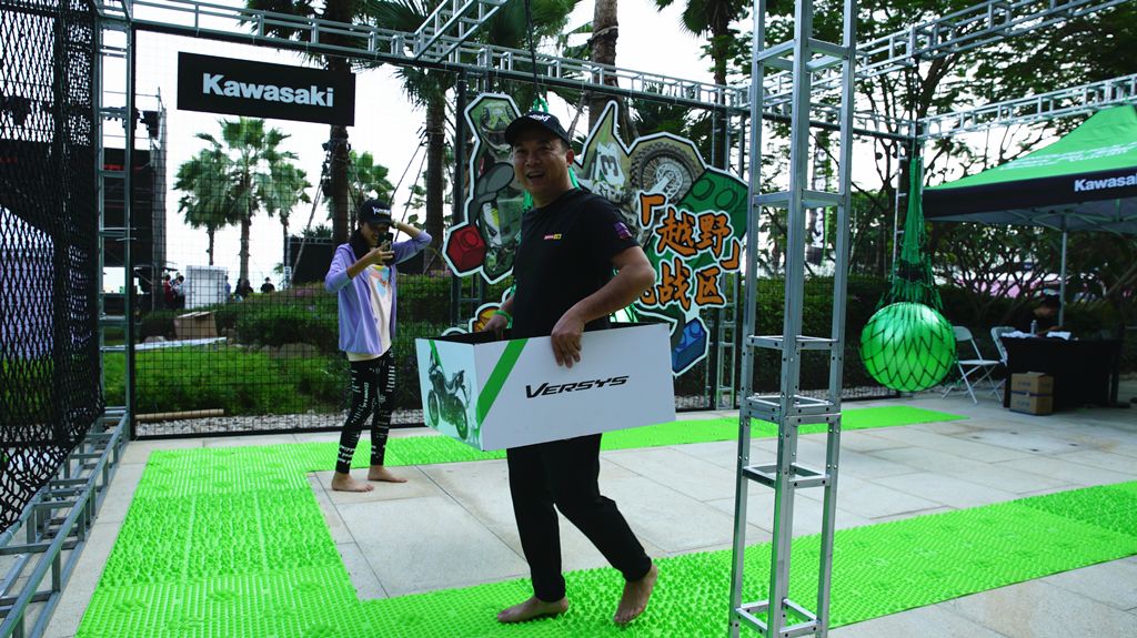 女子组冠军由右侧男士代领 在忍者节之前,川崎在全国范围举行了Z GAME绕桩计时赛的活动。通过层层角逐,最终产生了男女组两名总冠军,在这次忍者节上为他们正式颁奖,奖品就是两台崭新的Z400。就在我觉得奖品太硬核了的时候,台下的摩友们却喊出了,下次送川崎H2吧!!(台上的川崎领导身形一晃……)