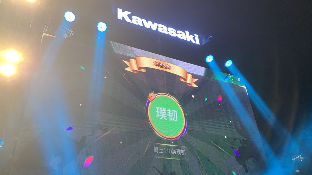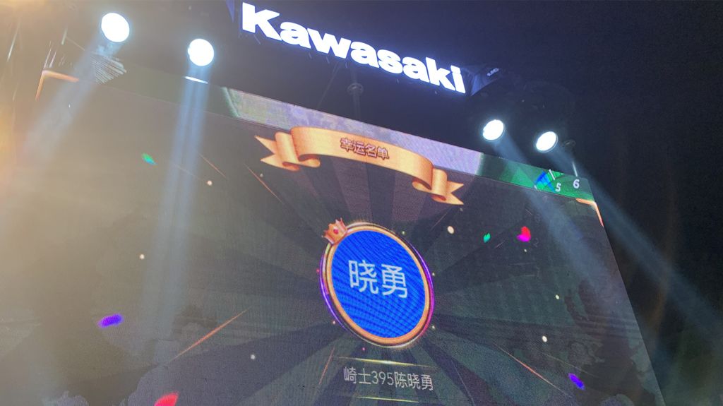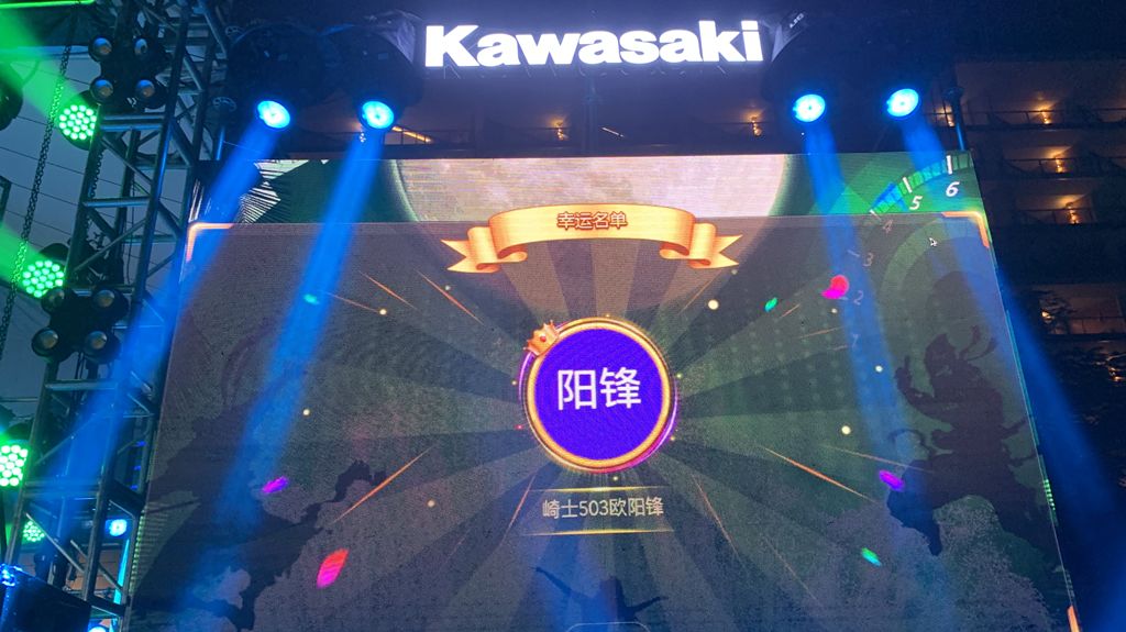 虽说上面两台Z400和现场摩友没太大关系,但最后的大奖却是从现场抽取一名最幸运的摩友,赠送一台崭新的川崎Ninja400!俗话说:好事多磨。连续抽取了两名幸运的摩友,可惜的是这二位竟然没在现场,完美地和大奖擦肩而过。最终幸运大奖落在了一位名字霸气的摩友身上。