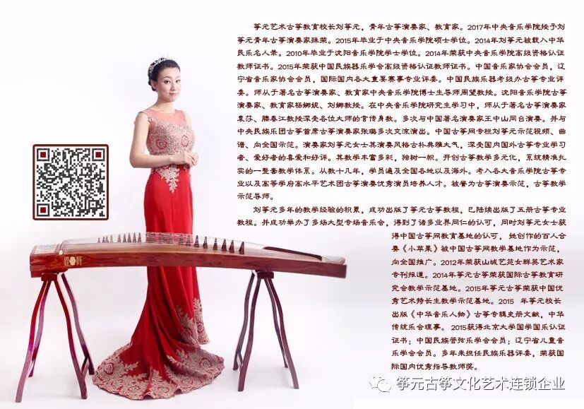 筝元艺术古筝教育校长刘筝元,青年古筝演奏家、教育家。2017年中央音乐学院授予刘筝元青年古筝演奏家殊荣。2015年毕业于中央音乐学院硕士学位。2014年刘筝元被载入中华民乐名人录。2010年毕业于沈阳音乐学院学士学位。2014年荣获中央音乐学院高级资格认证教师证书。2015年荣获中国民族器乐学会高级资格认证教师证书。中国音乐家协会会员,辽宁省音乐家协会会员,国际国内各大重要赛事专业评委。中国民族乐器考级办古筝专业评委。师从于著名古筝演奏家、教育家中央音乐学院博士生导师周望教授。沈阳音乐学院古筝演奏家、教育家杨娜妮、刘娜教授。在中央音乐学院研究生学习中,师从于著名古筝演奏家袁莎、滕春江教授深受各位大师的言传身教。多次与中国著名演奏家王中山同台演奏。并与中央民族乐团古筝首席古筝演奏家张璐多次交流演出。中国古筝网专栏刘筝元示范视频、曲谱、向全国示范。演奏家刘筝元女士其演奏风格古朴典雅大气,深受国内国外古筝专业学习者、爱好者的喜爱和好评。其教学丰富多彩,独树一帜。开创古筝教学多元化,系统精准扎实的一整套教学体系。从教十几年,学员遍及全国各地以及海外。考入各大音乐学院古筝专业以及高等学府高水平艺术团古筝演奏优秀演员培养人才。被誉为古筝演奏示范,古筝教学示范导师。