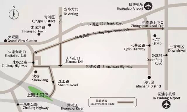 自驾路线:从上海出发G50沪青平高速公路从朱家角出口下—左转进入朱枫公路—左转进入沈砖公路—右转进入沈太路—靠右进入环岛—由环岛走1出口进入中新桥—到达酒店