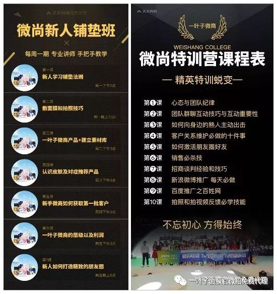 加入代理后免费培训,培训分为八个板块:产品、销售、招商、引流、刷圈、心态、管理、目标,每一个板块的课程都是优秀代理的实操经验总结而来的。