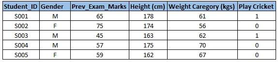 从上图可以看到,输入变量(预测变量Predictor)是性别,之前的考试分数,身高,体重。而输出值(目标变量Target)是是否玩板球。学生编号和性别是字符变量(Character),是否玩板球,之前的考试分数,身高,体重是数字变量(Numeric)。从连续和非连续来分类的话,性别和是否玩板球是非连续变量(Categorical),之前考试的分数,身高和体重是连续变量(Continuous)