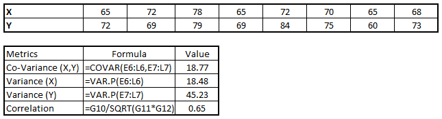 如果使用Excel,可以用CORREL()来计算两个变量的相关。如果使用SAS可以使用PROC CORR来计算相关,如果用R,可以使用cor.test()来计算相关。如果用Python,可以使用numpy.corrcoef()来计算。下面是用EXCEL计算相关的例子,X和Y的相关系数是0.65。