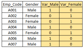 还有一个普遍的情况就是创建所谓的虚拟变量,一般用虚拟变量把非线性的变量变成数值变量。虚拟变量又叫指标变量。比如对于性别(gender)有男和女两种,那么我们可以建立两个新的变量一个叫Var_Male,它的值为 1(男)和0(女),然后Var_Female变量,它的值为 0(男)和1(女)。如果非连续变量有n层(大于2),那么可以创建n-1个虚拟变量。下面这个图就是用性别变量(gender)来创建两个虚拟变量(dummy variable)。