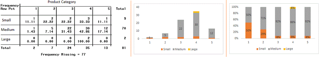 双向表(two-way table):我们可以用一个双向表来分析两个非连续变量的关系,双向表的行代表一个非线性变量的分类,列代表另一个非线性变量的分量,然后每个小格(cell)可以显示数目还有所占的百分比(双向表是下面最左边的表)。