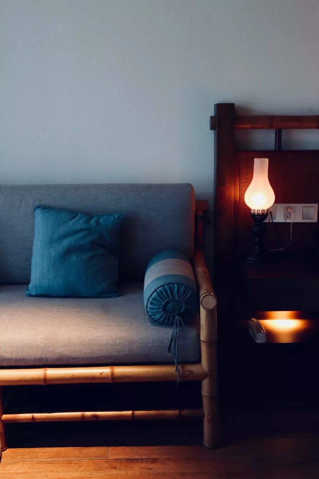 房间的装修设计为简约的徽派风格,墙面写意的山水画、天然质朴的竹编、实木地板,整个空间低调又不失韵味。