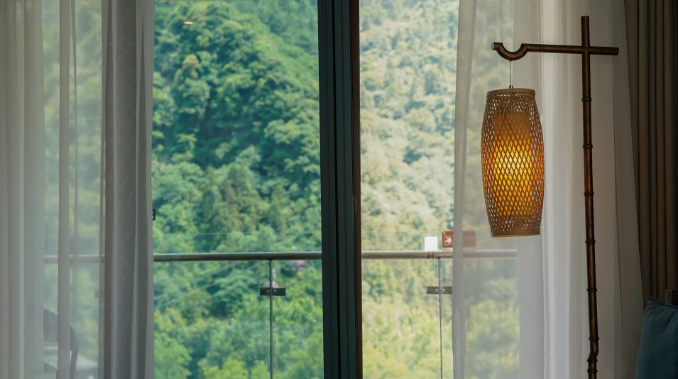 酒店共有290间客房,每间房都有宽敞的阳台,从落地窗一眼看去,对面齐云山上下穿行的缆车就在眼前。