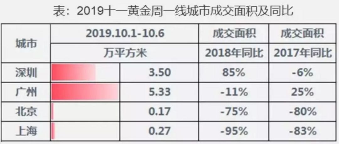 十一黄金周期间,四个一线城市里,除了“先行”大利好加持的深圳,其余三个城市,成交量全都惨淡异常:广州,同比下跌11%;北京下跌75%;上海更是下跌接近100%。