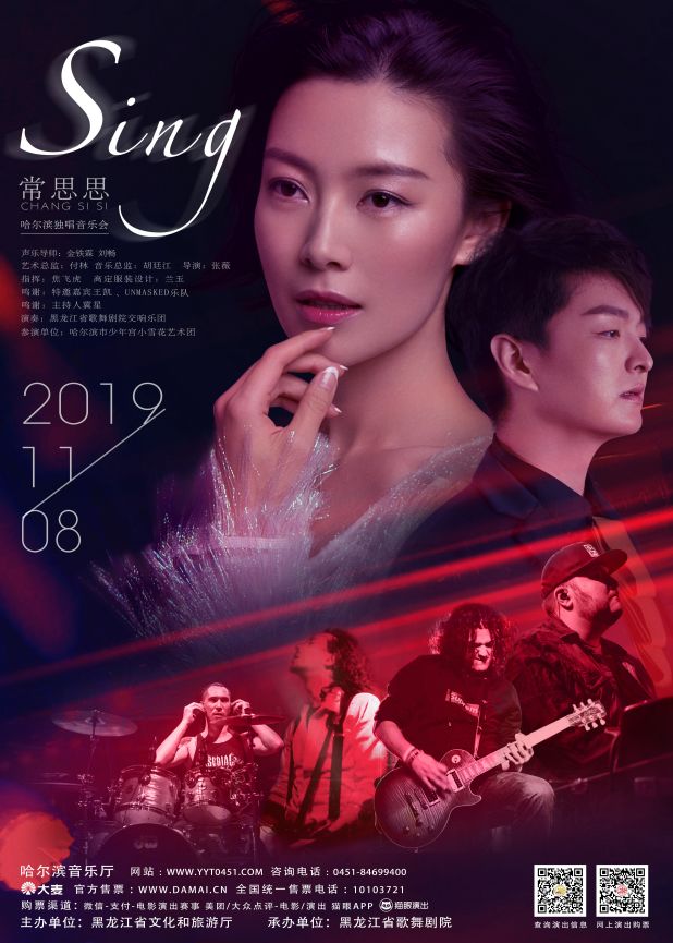 11月8日常思思将在中国最具国际化的城市之一哈尔滨举办个人独唱音乐会,音乐会除了有常思思的倾力演唱之外,还有黑龙江歌舞剧院交响乐团以及来自巴西、法国、俄罗斯乐手组成的跨国摇滚乐队UNMASKED加持,整场音乐会将呈现出古典与流行,摇滚与美声的新融合,带来一场高水准国际化的视听盛宴。