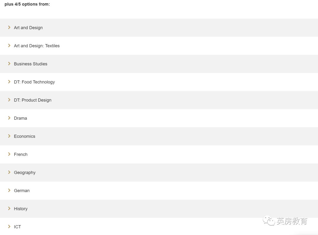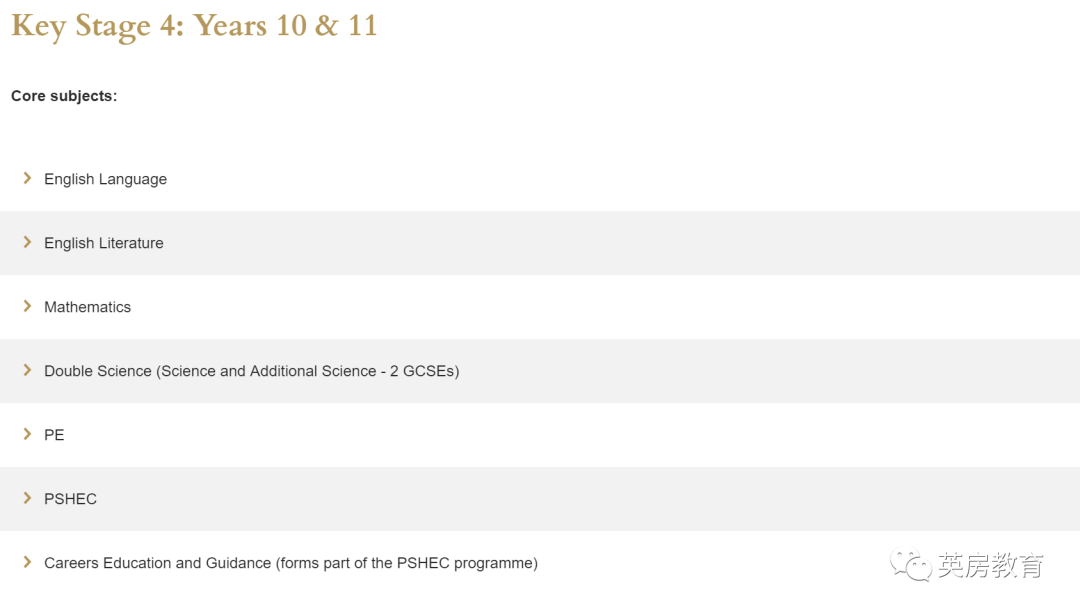 10和11年级:必修课(英语和英国文学、数学、两门理科、PSHEC(个人修养教育)、体育、职业规划与指导)和选修课(4-5门)