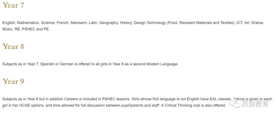 7-9年级:英语、数学、理科、法语、普通话、拉丁语、地理、历史、设计技术(食品、抗性材料和纺织品)、信息技术、艺术、戏剧、音乐、RE、PSHEC和体育