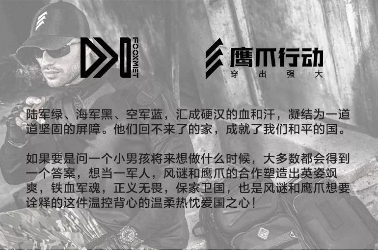 风谜这款产品与鹰爪合作,鹰爪品牌是全国第二大军品品牌,多年的军品设计经验让这款背心穿起来更加英姿飒爽。