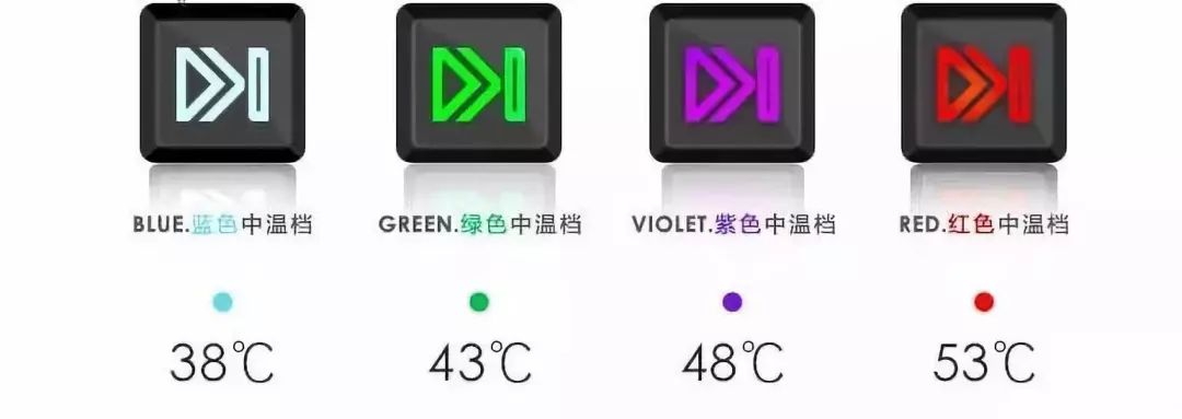 白灯是38℃,室内可穿着;绿灯是43℃,紫灯48℃,日常城市通勤穿;红色灯的53℃可以穿着去滑雪了。