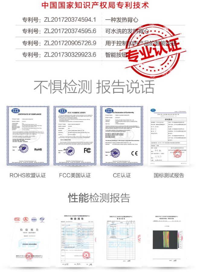 风谜智能温控背心还得到了ROHS欧盟认证、FCC美国认证,CE认证,给你满满的安全感!