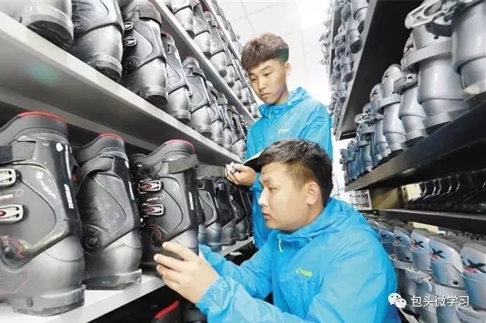 扎兰屯金龙山滑雪场内,工作人员正在检查滑雪鞋、核对鞋号。