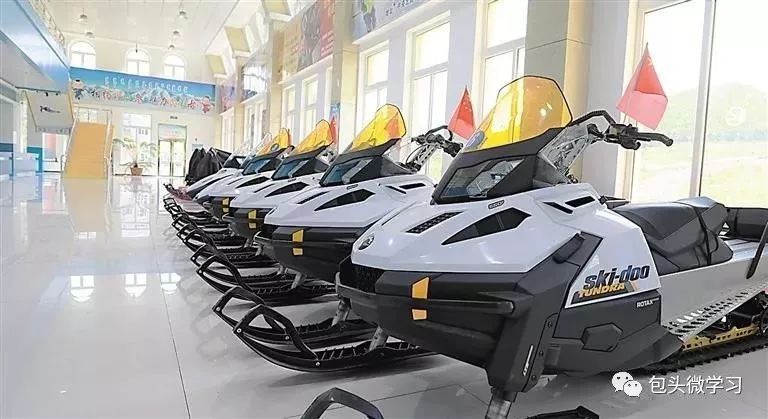 冬季比赛工作用车雪地摩托已检修完毕,整装待发。