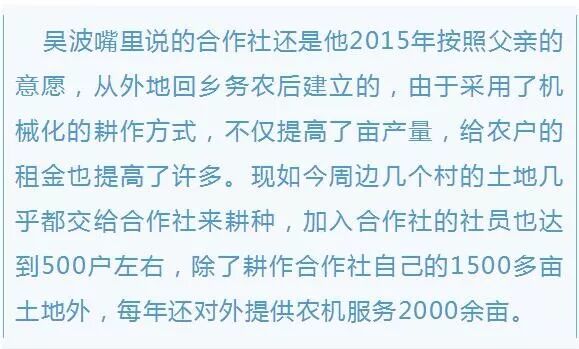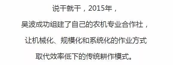 由于合作社取得了良好的经济和社会效益,不仅周边农户得到了实惠,吴波本人也先后被上级部门推荐和评选为新型农业经营主体带头人、江苏省最美农机手、第三届溧阳“天目湖英才榜”后备人才,还被当地村民推举为戴埠镇姚墅村姚南组、姚东组和姚西组的生产队长。