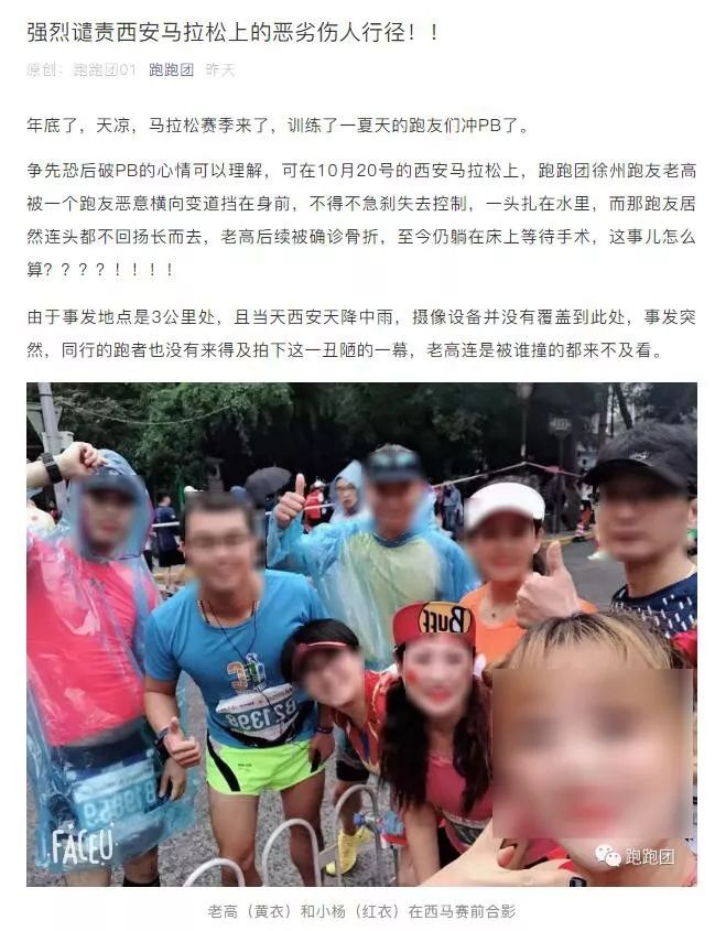老王今天在群里看到了一个令人气愤的事情——《强烈谴责西安马拉松上的恶劣伤人行径!!》