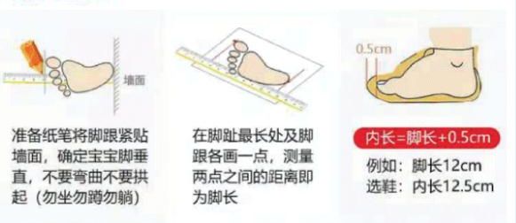 测量宝宝脚长时,先让宝宝光脚靠墙站立,脚丫完全舒展开,在最长的脚趾处做记号,然后测量墙壁和记号之间的距离,这就是宝宝的净脚长。脚胖、脚宽、脚背高的宝宝,建议在此基础上大一码哦~