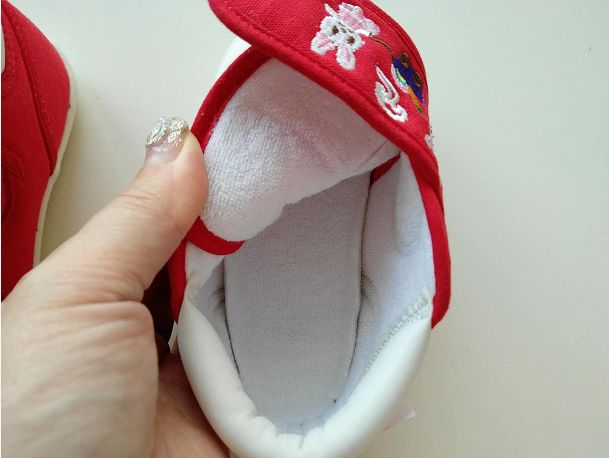 宝宝脚的形状呈扇形,跟咱们大人是不一样的。选的时候,鞋头处要宽敞,空间大,呈流线型圆头,这样小脚丫舒展开,走路也舒服。
