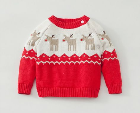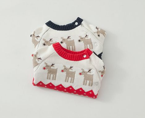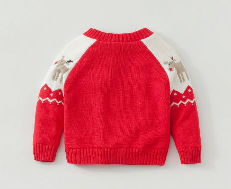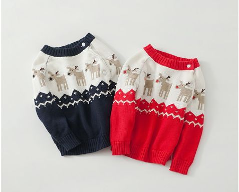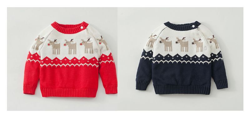 小鹿提花毛衣是2个颜色,藏青色和红色,是圣诞主题最经典的两个颜色了,而且男孩、女孩都能穿。