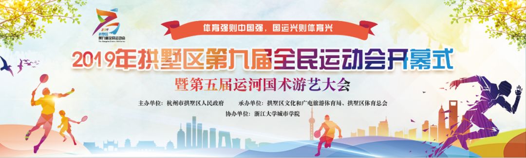 温馨提醒10月27日下午,2019年拱墅区第九届全民运动会开幕式暨第五届运河国术游艺大会将在浙江大学城市学院体育馆正式开幕。让我们一起期待这场体育、国术、艺术的盛会吧!