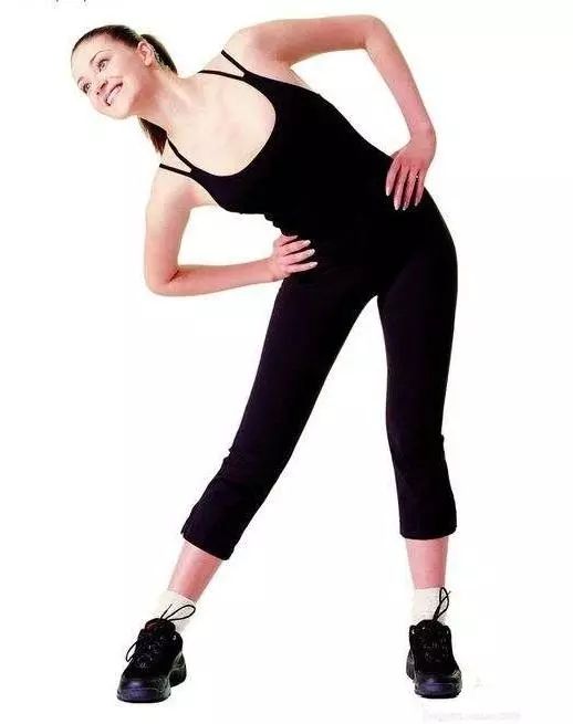 体侧弯练习: 身体直立,双腿分开,两足同肩宽,两手叉腰。上体以腰为轴,先向左侧弯曲,还原中立,再向右侧弯曲,重复进行并可逐步增大练习幅度。重复6-8次。